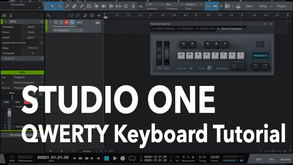 How to use Studio One’s in-built Qwerty Keyboard functionality to input MIDI notes, for those times when you don’t have an external MIDI keyboard or other input device connected to your laptop or computer.